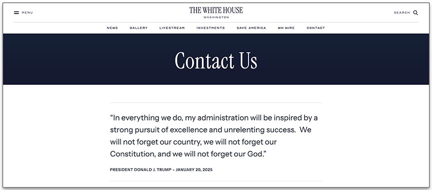 Up until recently, there was an actual email address for this. It was comments@whitehouse.gov. But it seems to be inactive now. So this leaves us with the “Contact Us” page on the official White House website.